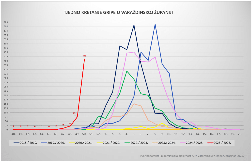 Tjedno kretanje gripe u Varaždinskoj županiji u sezoni 2025./2026.