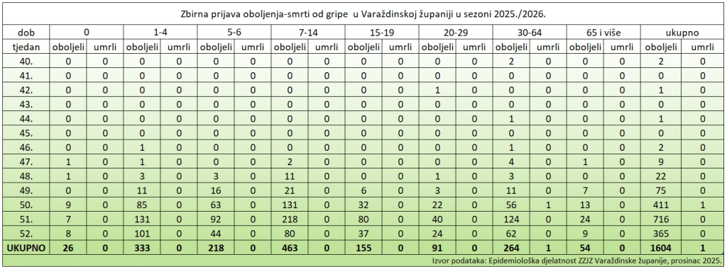 Tjedno kretanje gripe u Varaždinskoj županiji u sezoni 2025./2026.